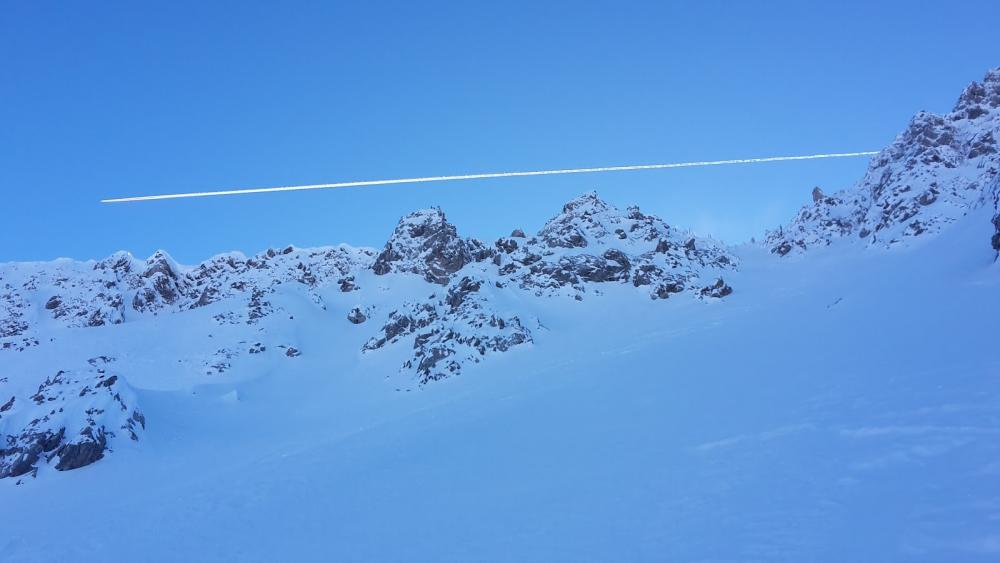 Ihre Spur konnte ich teilweise nicht sehen, habe also selber gespurt (nicht anstrengend). Anstrengend wurde es erst im steileren Bereich, weil ich immer wieder zurück- oder abgerutscht bin. Also Harscheisen an! Ging dann besser. Oben wirds immer steiler und ca. 50hm unterhalb Karausstieg ist mir die Sache (Lawinengefahr, Abrutschen) zu unsicher geworden und ich habe oberhalb eines Steinabsatzes Schluss gemacht. Abgefellt, Bandagen an, Schuhe zu und runter. Nicht leicht zu fahren (viel Windharsch), aber es gab immer wieder Stellen mit schönerem Pulverschnee. Dann rüber zur Piste gequert. Dort habe ich Philipp getroffen, der eine späte Skitour zum Marienbergjoch gemacht hat. Habe aufgefellt und bin auch hoch zum Marienbergjoch und mit Philipp noch ein paar Meter links weiter, um in den Genuss der Abendsonne zu kommen. Sehr schön. Der Schnee in den Westhängen schien besser (kein Harsch) zu sein. Eher Firnartig. Aber oberhalb uns war eine Nassschneelawine abgegangen...