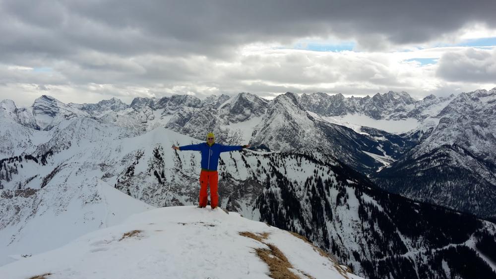 Forstweg ging sehr gut zum hochgehen. Allerdings in der Mitte teilweise schon aper. Dann kurzes Stück durch Wald und hoch auf die Wiesen. Bei den Latschen rechts um das Steilstück um und bis zum Gipfel (2101m).
