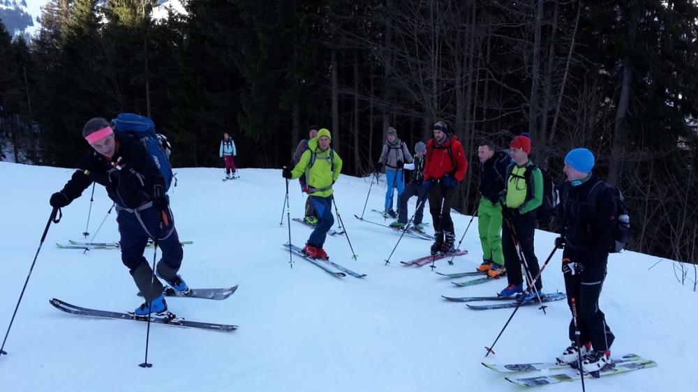 Schon der Anfang war mühsam: erst hat Helmut die Felle daheim vergessen (Timo hat ihn dann netterweise schnell heimgefahren), dann dauerte es etwas, bis alle Autos/Teilnehmer am Taubenstein Parkplatz waren, dann brauch bei Martina der Skitstecken, dann hatten ein paar keine Harscheisen dabei. Und ich hatte meine zwar dabei, die musste man aber erst umbauen (und ausserdem musste ich im Nachgang ein youtube-video bzgl. der Montage gucken - so saubloede Harscheisen...).