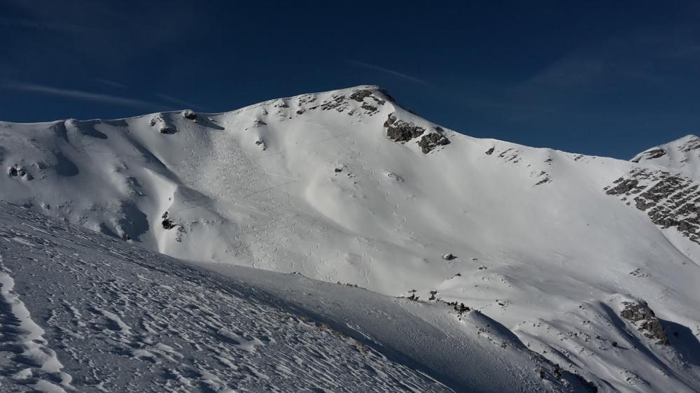 Abfahrt Gipfel war sehr schön. Danach gabs etwas Bruchharsch, v.a. aber habe ich mich von ein paar Spuren in die Irre führen lassen (die waren zu weit rechts), so dass wir ca. 100hm wieder aufsteigen mussten, um zur anderen Seite rüberzukommen. Am einfachsten ist es, wenn man sich an der Aufstiegsspur orientiert...