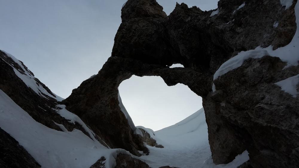Dann liegt das Kar vor einem. Wie immer eindrucksvoll. Hoch bis zur der Stelle, wo man Ski an den Rucksack packen muss und mit oder ohne Steigeisen weiter "klettert". Da waren schon 2 nette Franzosen, die nicht wussten, wie sie weiter sollten. Ich an ihnen vorbei und dann: habe ich auch gestoppt, da der Weg unter dem Felstor zum Teil schneefrei ist. D.h. man kann nicht vom Grat abfahren! D.h. man kann zwar irgendwie da hochklettern, ich wüsste aber nicht, wie ich da wieder runter kommen sollte (zumindest schwierig mit Ski am Rucksack). Nach kurzer Diskussion haben wir's gelassen und sind stattdessen 2 mal das schöne Kar runter. Ein mal links, ein mal rechts. Bei der ersten Abfahrt haben wir den MTB-Ausbilder Michael getroffen, der mit Freunden und Hund unterwegs war. Lustig. Die sind zwar zum Teil durch das Felsentor durch, aber ohne Ski.
