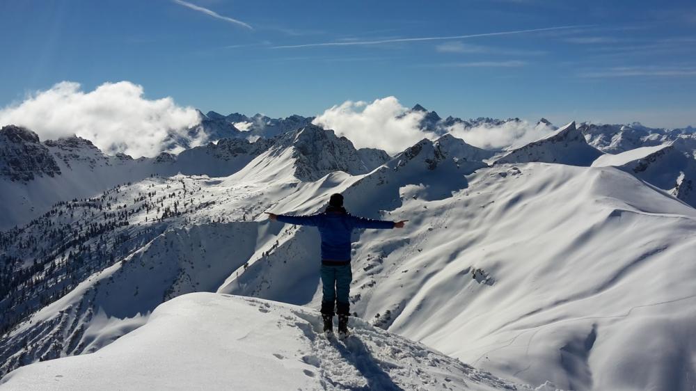 Wir auf den Gipfel (2084m) mit toller Aussicht. Entdeckt haben wir dabei die nächsten Berge, z.b. die Schochenspitze (2069m) mit nur 4 Abfahrtsspuren. Wir also von der Sulzspitze runter und zur Schochenspitze rüber (ca. 220hm bis zum Gipfel).