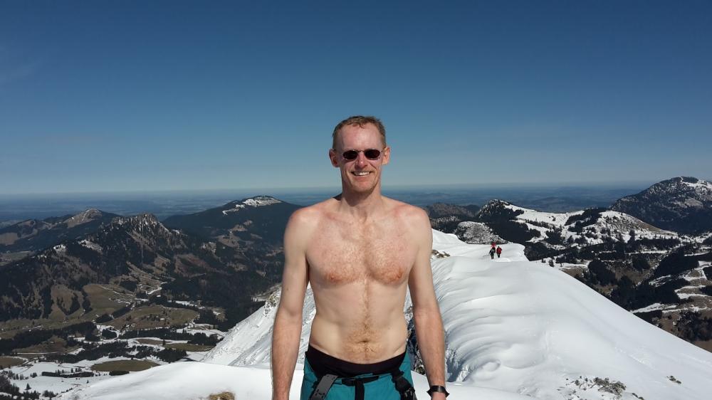 Wieder am Gipfel beschlossen wir direkt nach Osten abzufahren - direkt in die Mulde rein. Oben sind das wunderschöne Hänge. Super Firn. Unten kommt man dann in den Wald und stellenweise zu wenig Schnee bzw. zu schlechter Schnee. Frank, Björn und Ludwig liessen den letzten Teil aus und sind sinnvollerweise zur Piste gequert. Unten alle wieder getroffen und gemeinsam auf der Piste abgefahren. Schön!