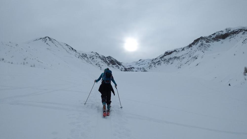 Dann wieder aufgefellt und nach rechts (Bach entlang) hochgespurt. Dort hatten wir 2 andere Tourengeher gesehen, die in ein Hochtal unterhalb des Il Corn hochspurten. Nach einem steilen Aufschwung machten wir Stopp. Leider war da auch die Sicht schlecht, so dass die ersten Meter der eigentlich schönen Abfahrt Blindflug waren. Danach haben wir uns an die Skispuren gehalten und sind über flache Hänge nach links, bis wir zu den schönen Pulverhängen kamen, die wir schon von unserer Tour 3 Jahre früher kannten. Ca. 400hm (untere Teil im Wald) sehr schöner Schnee. Dann rüber zur Aufstiegsspur und die aufgelassen Piste abgefahren.