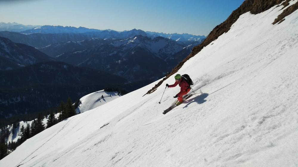 Hoch Richtung Rotwand. In der langen Querung unterhalb des Rotwandkopfes gestoppt und wieder in schönem Firn abgefahren. Bis zur Alm, die wohl im Vorwinter von einer Lawine eingedruckt worden sein muss.