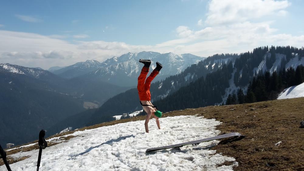 Ich bin mit Schneeschuhen und Snowboard am Rucksack gegangen. Martin mit Skier. Piste hoch. Wenig Skifahrer kamen entgegen. Oben war ein kleines Schild "Piste geschlossen". Auf der Stümpflingseite waren etwas mehr Skifahrer, aber vermutlich waren es insgesamt mehr Tourengeher als Pistenfahrer. Rosskopf mit Skiern erreichbar. Schöne Aussicht, leicht windig. Da Martin nachmittag ein Date hatte, sind wir nicht Stümpfling runter, sondern nur die Sutten. Ging gut zum fahren, wird aber nicht mehr lang gehen, da die Piste an ein paar Stellen schon sehr sehr dünn ist. Danach noch kurz ins Café in Rottach zum Kuchen kaufen :)