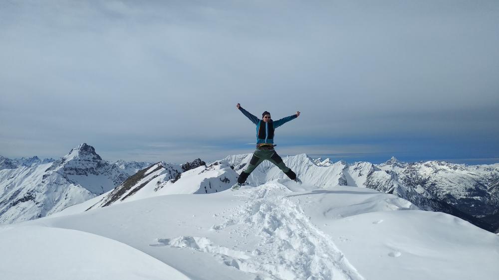 Nach kurzer Diskussion entschieden wir uns geradeaus zum Seelakopf hochzugehen. Spur war gut angelegt. Die obersten Meter zum Grat muss man zu Fuß stapfen. Dann am Grat nach Osten bis zum Gipfel (2368m). Tolle Aussicht und man sieht ein paar Rinnen nach Osten. Dort dann rein und auf feinsten Hängen runter. Bei größerer Lawinengefahr zu gefährlich.