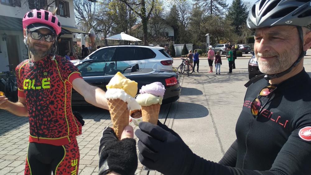 Thanning. Und dann Richtung Isar. Durch Ascholding und immer nach Norden. Nach Straßlach hoch und in der Eisdiele ein sehr leckeres Eis gekauft. Weiter auf normalem Weg nach Oberhaching und durch den Perlacher Forst. Am Zoo getrennt. Ich bin noch zu Achim und habe das E-Bike angeschaut.