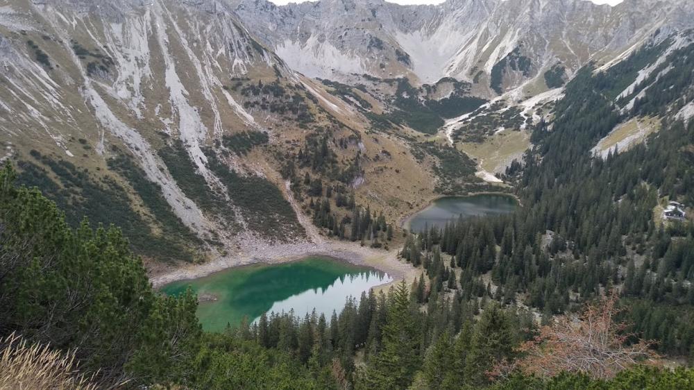 Auf Forstweg nach Krün. Geht etwas rauf/runter. Forstweg zur Fischbachalm hoch (anstrengend). Runter zur Materialseilbahn und so weit wie möglich hoch geradelt (wieder anstrengend). Pause auf der Höhe der Seen und dann zur Jägersruh hochgeschoben/getragen. Diese Strecke dauert 45 Min. Wenn ich mehr Zeit gehabt hätte, wäre ich noch die ca. 150hm zur Gumpenkarspitze hoch.