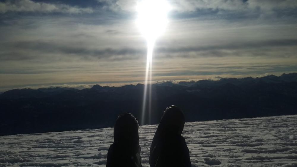 Rechts geparkt und den rechten Hang mit meinem Amplid-Splitboard hoch. Ging meist gut, nur manchmal rutschig. Ohne Stop bis zur Gipfelhütte und dort schön in die Sonne gesetzt.