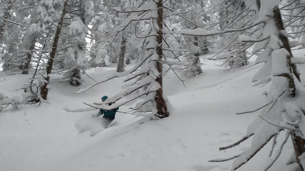 Abgefellt, Splitboard zusammengebaut und dann direkt in den Wald nach Nordosten abgefahren. Dies war aber keine gute Idee, da es zwar massig Schnee gab, aber keine Unterlage, d.h. man ist oft an Bäumstümpfe und Wurzeln etc angestossen. Ausserdem lag so viel schwerer Schnee am Board, dass man gar nicht richtig ins Fahren kann. Mist.