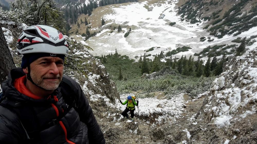 Wieder runter, dabei habe ich eine steile Rinne gesehen, die vielleicht zum Ausprobieren lohnenswert wäre (beim Aufstieg ganz links hoch).