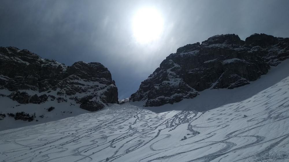 Also erstmal ins Kar und hoch zum Skidepot und zu Fuss durchs Felsentor und weiter zum Gipfel (1808m). Wir waren ganz alleine dort und genossen Aussicht und Wetter.