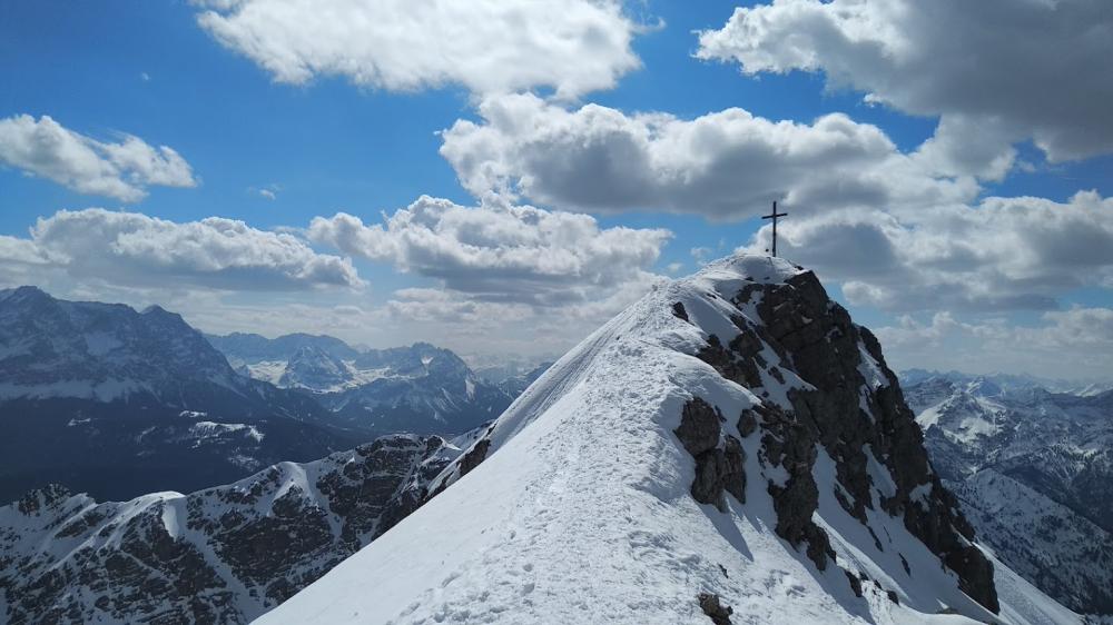 Der eigentliche Aufstieg ging dann ganz gut. Schnee war griffig. Die meisten anderen Skitourengeher kamen uns entgegen. Rechts aus dem Kar raus und am Grat/Rücken entlang zum Gipfelhang. Das aber ohne Ski bzw. Snowboard. Man hätte ein paar Mal Ski tragen müssen. Bedingungen waren gut, so dass der Gipfelhang unproblematisch war. Super Aussicht. Gipfel ist 2156m hoch.