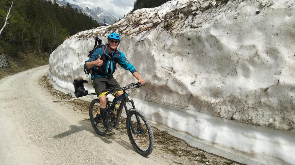 Dann wieder abschnallen und zum Trafohäuschen wandern (auch sehr mühsam) und mit dem Bike nach Scharnitz zurück (zieht sich).