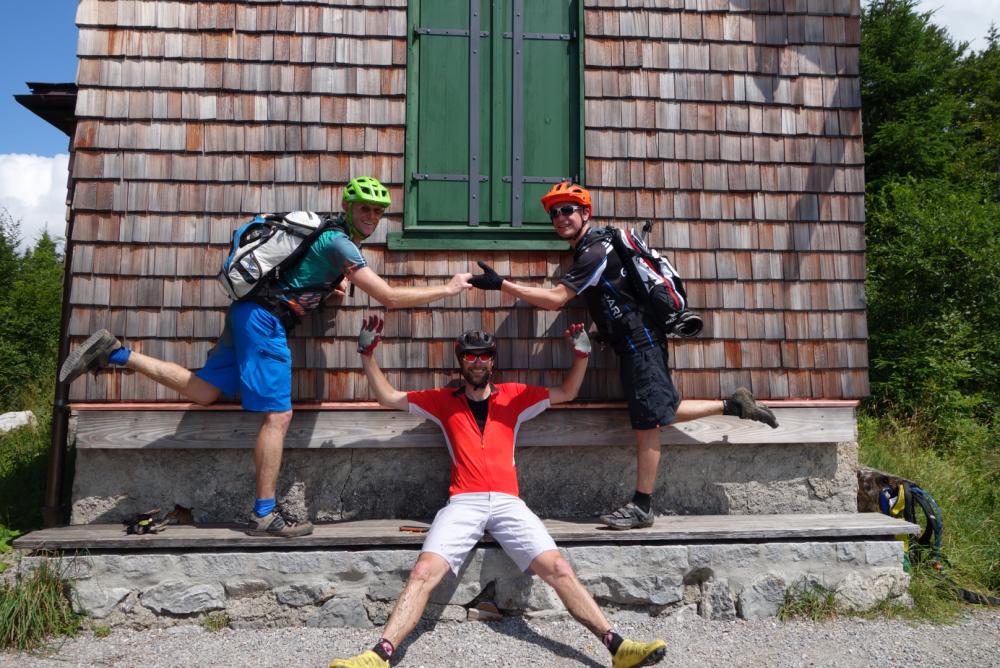 In Wuschel's Polo kam Ingo's S-Rahmen. Die beiden grossen Bikes an den Radträger. So konnten wir zu dritt ganz gemütlich zum Kochelsee fahren. Dort an der Fabrik geparkt und nach oben zur Kotalm. Kurze Rast, danach auf Trail Richtung Jachenau. Der Trail war super matschig und rutschig und hat nicht viel Spass gemacht (starke Regenfälle am Tag zuvor). Bin zwar nicht mit dem Bike, aber zu Fuss ausgerutscht. Danach durch die Jachenau zum Walchensee und mit dem Uhrzeigersinn nach Niedernach. Dort dann den Forstweg hoch und bei der Abzweigung nach rechts (Sackgasse!). Teilweise steil, schwül und anstrengend. Letztes Stück hoch ist ein kleiner nicht markierter Trail. Man gelangt an eine nicht bewirtschaftete DAV-Hütte (Hochkopfhütte). Gipfel Altlacher Hochkopf. Schöne Aussicht: links Soierngruppe, Mitte Wallgau, rechts Walchensee. Dort geht ein Wanderweg zum Walchensee runter, der anfangs sehr gut fahrbar, dann leicht ausgewaschen und am Ende immer schwieriger wird. Hat aber richtig Spass gemacht. Empfehlung!