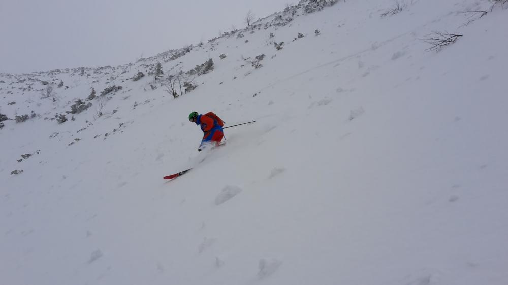 Rüber zum Jägerkamp. Einfahrt in Jägerkamp Nord bisschen schwierig, da harte Unterlage und der Neuschnee etwas gerutscht ist und es Lawinenboller gab. Aber danach super schön zu fahren. Toller Powder. Unten etwas schwerer werdend. Bei 1250m Abfahrt gestoppt und wieder aufgefellt und hoch zum Jägerkamp (1746m) gespurt. Den ersten Teil hat Sven, danach ich gespurt. Im letzten steilen Hang war es nicht ganz ohne, aber es hat funktioniert. Kurze Gipfelrast und runter zu den Almen (auch diese Abfahrt war gut!) und über Piste zum Auto.