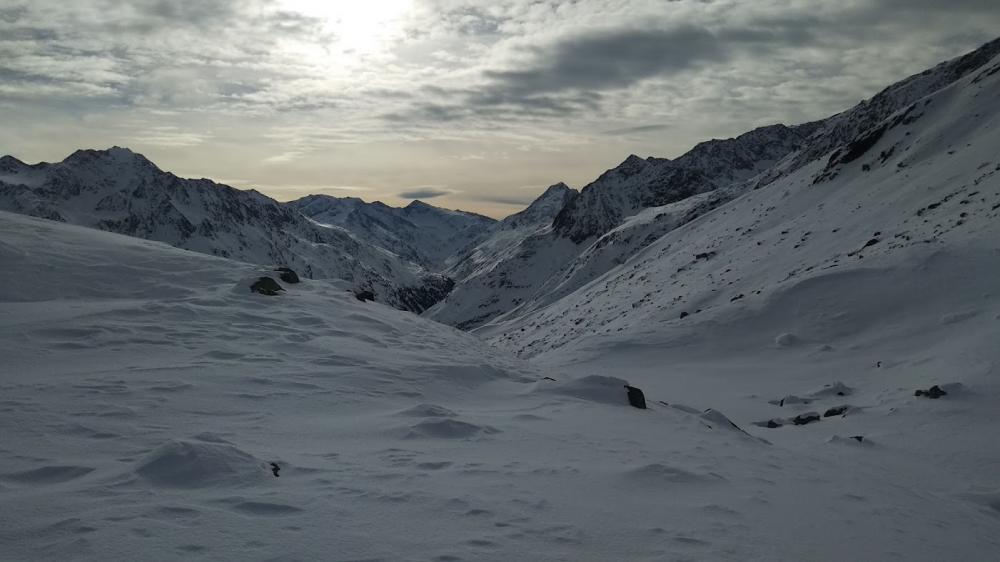 Der sogenannte Nene-Trail führt aber schön hoch und geht am Heidelift links vorbei. Danach zur Heide-Alm hoch und nach langem Überlegen (welche Tour) bin ich zum Fennar-Trail rübergequert. Am Anfang konnte ich dem Trail leicht folgen. Viele Tierspuren auf dem Trail. Leider aber ich aber irgendwann den Weg verloren und musste dann mittels GPS und Orientierung navigieren. Ich peilte das Petznerkar und den Petznersee an und bin über ein paar Steilstufen hoch. Harscheisen wären ab und zu sinnvoll gewesen. Irgendwann (das ist eine lange Tour!) sag ich den Tiefenbachferner vor mir.