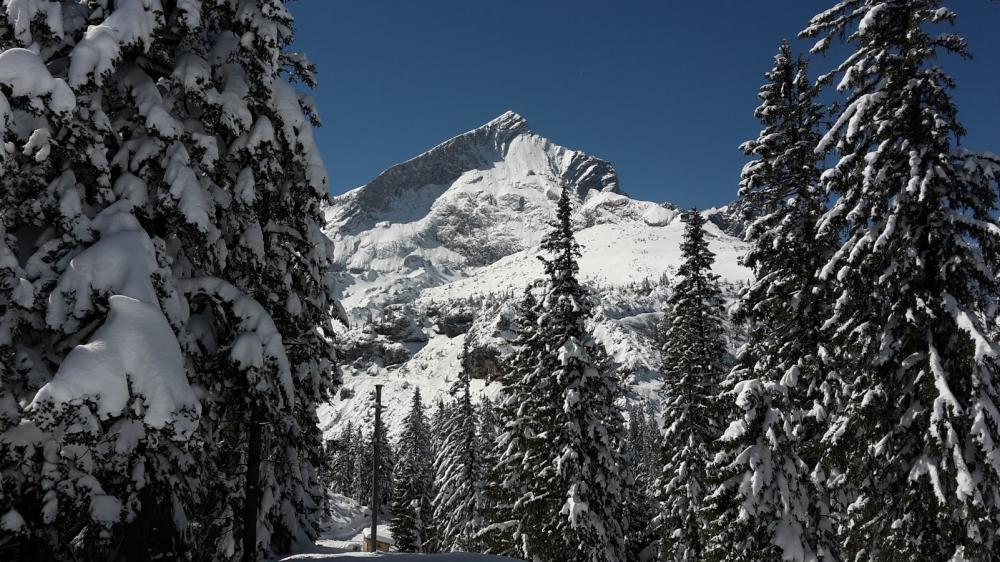 Und dann rechts in den Wanderweg zum Kreuzeck. Romantisch verschneit mit tollen Ausblicken auf Garmisch.