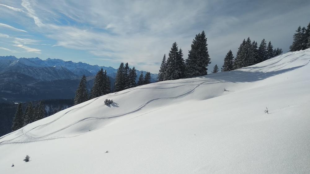 Wieder hoch zum gleichen Punkt (uns fiel nichts besseres ein) und die gleiche Abfahrt nochmal (war ja auch richtig gut). Und dann ein drittes Mal hoch und zum Brauneck-Gipfel. Dort zufällig Alexander getroffen und mit ihm im DAV-Haus eingekehrt. Sehr gute Suppen, wenig los (war ja schon 14.45 Uhr).