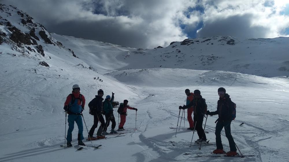 Pause dann unten in der Mulde (Abfahrt war ok). Dann wieder aufgefellt und zum Grubenkopf (2337m) hoch. Wobei wir nur zum Joch und nicht zum Gipfel sind (sehr sehr windig).