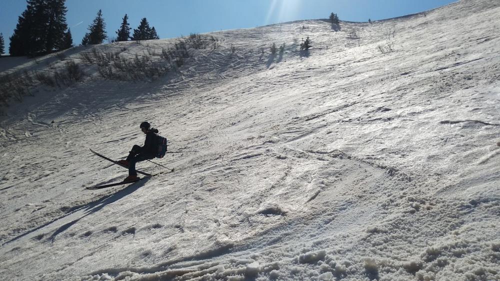 Abfahrt Setzberg Südost. Sehr schöner Hang, wo der Schnee grad noch gereicht hat. Leider konnte man nicht ganz runterfahren, da das unterste Stück aper (und sehr steil) war.