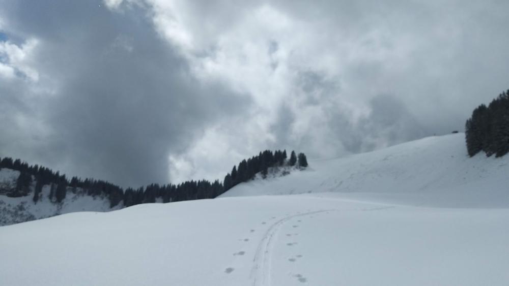 Die Verhältnisse waren überraschend gut. Nur ganz wenig apere Stellen. Hoch zum Rosskopf, wo dann leider ein Schneessturm einsetzte.