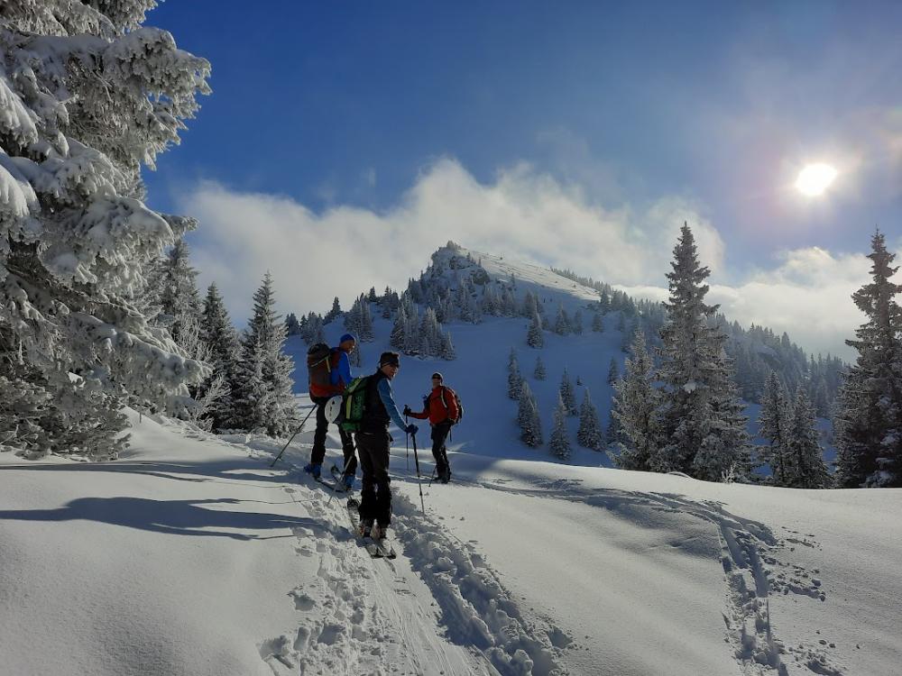 Abfahrt so weit wie sinnvoll. Dann wieder aufgefellt und hoch zum Taubenstein. Sehr schön sonnig.