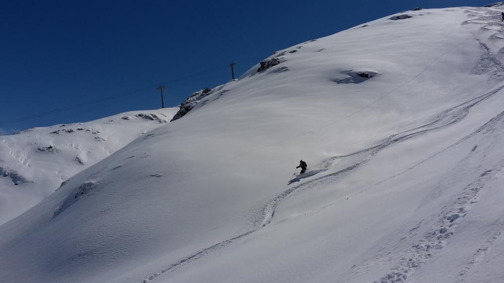 St. Anton unten wenig Schnee, aber St. Christoph sah schon gut aus. Wir haben dann bei der Albona-Bahn geparkt (wie viele andere auch) und sind da hoch. Etliche kamen uns schon strahlend entgegen. Winterwonderland mit schönem Pulverschnee. Oben angekommen, beschlossen wir Richtung Süden zum Sessellift Albonagrat abzufahren. Das war zwar total einsam, der Schnee hatte aber schon einen Stich und war weniger als auf der Nordseite. Hochgespurt und dann auf den Maroikopf (2522m) hoch. Dort lange Pause (alle anderen waren schon weg) und zur Abfahrt eine schöne Stelle (man musste etwas über den Grat gehen) gesucht. Kurzes, aber sehr geiles Stück. Abfahrt ins Maroital, wo wir wieder auf unsere Spur gestossen sind. Wieder hoch zum Albonagrat (Albonahaus) und dann diese breiten Nordhänge nach Stuben runter. Da waren zwar schon viele Spuren, aber die Hänge sind so breit, dass jeder von uns noch viel unverspurten Platz hatte. Einfach nur geil! Die untersten zwei Hänge hatten dann schweren Sumpfschnee, aber wir sind gut nach Stuben gekommen. Dort habe ich dann probiert, per Anhalter die paar Km zum Auto zu fahren, aber mich hat niemand mitgenommen :( Ella hatte auch nicht mehr Glück, dann kam aber der Bus... Übernachtung im Gasthof Arlberg in Stuben. Ein super super Tag!