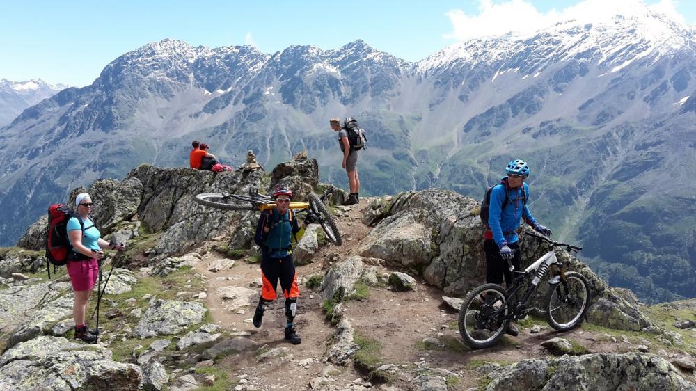 auf der Straße hoch zum Timmelsjoch (2509m). Die Straße zwischen Sölden und Gurgl ist super nervig, da viel los und einige Tunnels/Galerien. Ab der Mautstelle wars aber ganz nett zum Hochfahren. Oben Pause und dann in den Wanderweg wieder zurück. Urweg Timmelstal. Teilweise sehr schön, teilweise anspruchsvoll. An der Abzweigung Richtung Zwieselstein, evtl. waere aber der Weg zum Sahnestüberl besser gewesen. Und dann Richtung Zwieselstein. Auf unserem Trail musste man mehrfach abwärts schieben/tragen, da sehr steil/verblockt. In Zwieselstein wieder auf schönem Flusstrail nach Wildmoos. Kurz hoch und netten Abschlusstrail nach Sölden. Und dann mit der Ötztalkarte noch einmal mit der Gondel rauf und den Flow/Pump-Trail runter. Diesmal sogar das schwarze Stück. Geil!