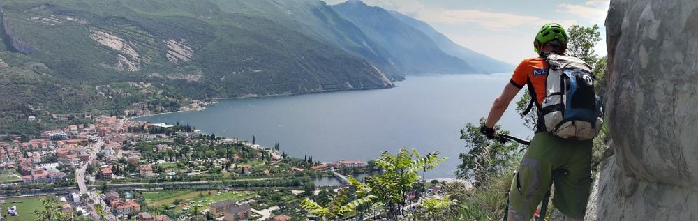 Mittagspause im Eiscafe am Hafen in Riva. Dann hoch auf den Monte Brione. Nochmal ca. 300hm. Super Aussichten. Und ab in den Trails (hinter dem Turm gehts los). Schöne kurze steile Trailstücke. Perfekt zum Üben und Lernen.