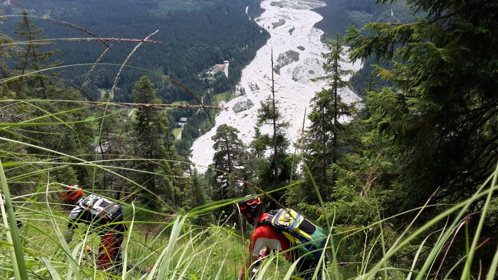 Thema war Spitzkehren-Training. Holger hatte mir einen Trail mit vielen Spitzkehren verraten: Vom Rißsattel nach Vorderriss. Da mussten wir aber erstmal hinkommen. Also parken in der Jachenau (in Bäcken). Hoch Richtung Luitpold-Alm und auf einer geigneten Wiese/Weg erstmal ein bisschen Spitzkehren im Trockenen ohne Absturzgefahr geübt. Nach 1.5 Stunden ging das schon ganz gut. Also noch die letzten Höhenmeter zum Trailanstieg (immer dem Schild "Vorderriß" nach). Geiler Ausblick auf das Rißtal. Toller Serpentinen-Trail. Viele schwierige Spitzkehren auf einem wirklich schmalem Weg. Wir haben die Spitzkehren mit unterschiedlichem Erfolg gemeistert. Manche Spitzkehren waren aber auch einfach zu schwer.