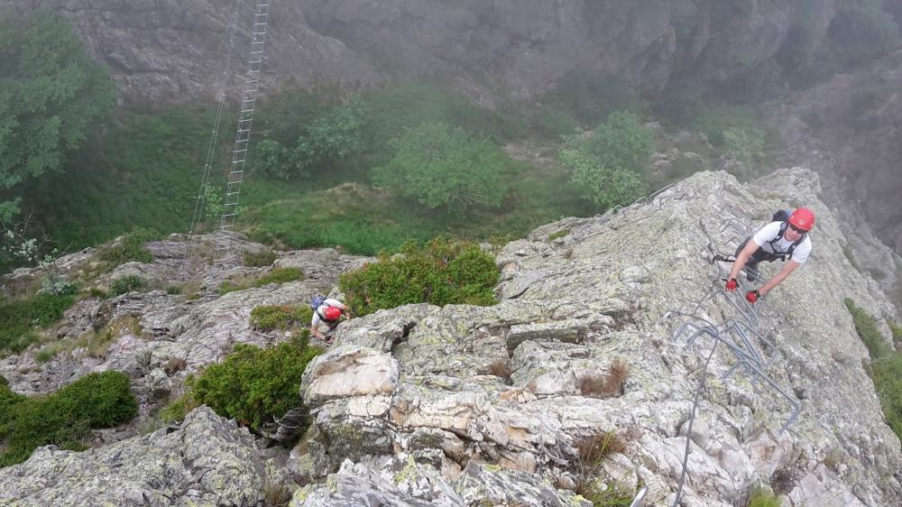 Mit Uli's Auto und ihm als Fahrer (beim nächsten Mal sitze ich lieber hinten ;) erst nach Magliolo und dann nach Isallo. Dann die kleiner werdende Straße weiterfahren, bis sie nicht mehr weitergeht. Bei einer Schranke gibt es einen Parkplatz. Wobei wir schon vorher gehalten haben, da die letzten Meter sehr holprig waren. Forstweg gehen und nach ca. 20 Minuten Einstieg in den Klettersteig, der relativ harmlos anfängt. Die erste Stunde ist sehr gemütlich, aber dann sieht man langsam immer mehr vom Berg und kommt an die steileren Stellen. Highlight ist das Überqueren einer Hänge/Seilbrücke. Sehr geil. Ca. 60m über dem Boden. Danach auch gleich steil weiter. Nach ca. 3h waren wir auf dem Gipfel. Leider war die Sicht sehr eingeschränkt, da der Gipfel in Wolken war. Zum Abstieg gibt's mehrere Möglichkeiten. Wir haben wohl die schnellste gewählt. Erst kurz den Klettersteig wieder runter und dann nach rechts über einen markieren Seitenausstieg raus. Alternativ hätte man um den Gipfel rumgehen können. Hätte aber bestimmt 20-30 Min länger gedauert.
