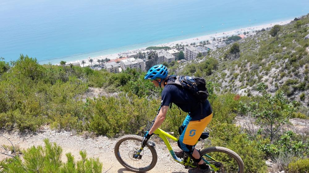 Wieder die schöne kleine Straße hoch (tolle Ausblicke aufs Meer) und bis zum Campingplatz. Dort kann man in die 24h Trails einsteigen. Die wieder gefahren wie 3 Tage vorher, diesmal keine Bike-Schäden - und dann weiter Richtung Noli. Dort einen Weg gesucht, der definitiv wenig befahren war und direkt runter nach Noli ging. Am Anfang stachelig und zugewachsen, am Ende steil und schwierig. Erschöpft Pause in Noli bei kalter Cola. Dann wieder hoch (steile Straße, aber wenig Verkehr) und wieder in die 24h Trails eingestiegen und wieder den Damen-Downhill runter (die anderen kannten dies noch nicht). Fotoshooting vor malerischer Kulisse.