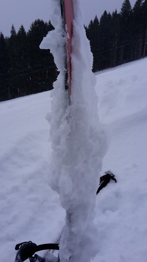 Parkplatz am Lift (noch kostenfrei). Dann im leichten Schneeregen los. Nach einiger Zeit wurde der Wind immer stärker. Besonders nervig war aber das Stollen. Siehe Foto...