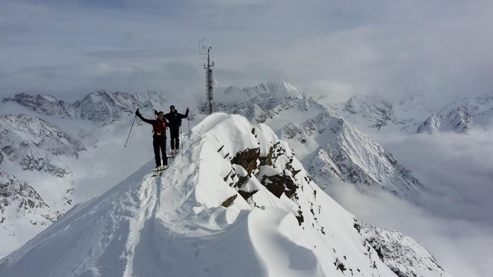Wir sind los und zum Winnebachjoch (2782m) hoch. Vor uns eine große Gruppe mit Bergführer. Vom Joch nach Norden zum Weißkogelferner. Am kurzen Gipfelhang die Entscheidung, ob der Hang sicher sei oder nicht. Nachdem der Bergführer gegen Weitergehen entschied und ein Schneeprofil graben 2 Gleitschichten hervorbrachte, liessen wir es auch gut sein und fellten um. Schöne Abfahrt über den kleinen Gletscher. Wir sind dann weiter durch ein langes Tal Richtung Winnebachseehütte. Links wäre ein sehr schöner Hang/Gipfel gewesen, für den wir aber leider keine Zeit hatten. Nach ein paar Querungen und ein paar kurzen Hängen haben wir wieder aufgefellt und wunderten uns über die sommerlichen Temperaturen. Rechts hoch Richtung Zwieselbachjoch. Von dort aus ging es steil zum Grieskogelferner zum Gipfel (3287m), von dem man aus eine super Aussicht hat. Bei der Abfahrt hätte man auch fast direkt vom Gipfel abfahren können, aber wegen der nicht so guten Sicht sind wir vorsichtigerweise erst den Aufstiegsspuren nach und dann links in den Gipfelhang. Sehr schön war die Steilstufe zu fahren. Ella wäre dann gerne über die Larstigscharte ins Larstigtal abgefahren. Da aber überhaupt keine Spuren zu sehen waren und die Sicht (hochziehende Wolken) immer schlechter wurde, sind wir mit den anderen die Normalroute zur Schweinfurter Hütte (2082m) abgefahren. Viele viele Flachpasagen, viel Geschiebe. Unten haben wir wegen den Wolken überhaupt nichts mehr gesehen und waren froh irgendwann die Hütte zu erreichen.