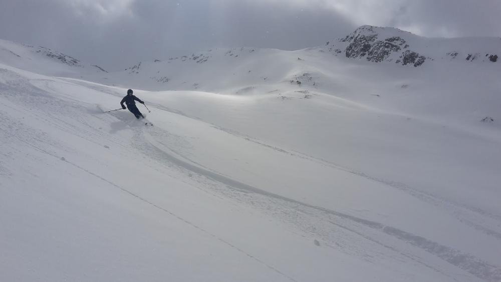 Alte Skipiste unschwierig hoch bis zur Bergstation/Almgasthof Maseben. Dann rechts am noch laufenden Schlepplift vorbei in das schöne Falbenairtal. Vor uns waren schon einge unterwegs und es gab zwei Aufstiegsspuren. Links steiler, aber sehr gut aussehend und rechts, erst flacher, dann aber unübersichtlich. Also für links entschieden. Spur war gut gelegt, allerdings die letzten Kehren in der Rinne doch etwas unheimlich. Das hat auch der Spurer, den wir oben getroffen haben, gemeint. Beim Skidepot Ski stehen gelassen und ca. 100hm hoch geklettert. Leider war Wetter nicht so toll. Windig und Sicht schlecht. Aber alle haben es zum engen Gipfel (3176m) geschafft. Bei der Abfahrt (wir sind unsere Aufstiegsspur entlang runter) hatten wir dann Glück. Es gab ein kleines Wolkenfenster und man konnte (bis auf die ersten Schwünge) was sehen. Super Hang. Super Pulverschnee. So schön, dass wir nochmal aufgefellt haben und 3 Schweizer zum nochmal hoch animiert haben. Wir sind dann nicht mehr ganz hoch, hatten aber wieder eine super Abfahrt. Die Hänge sind breit, so dass viele Spuren nebeneinander passen. Dann flach zurück zum Schlepplift und auf der Piste bzw. daneben zum Almgasthof und eingekehrt. Danach auf der alten Piste bzw. teilweise durch den Wald runter zum Parkplatz.