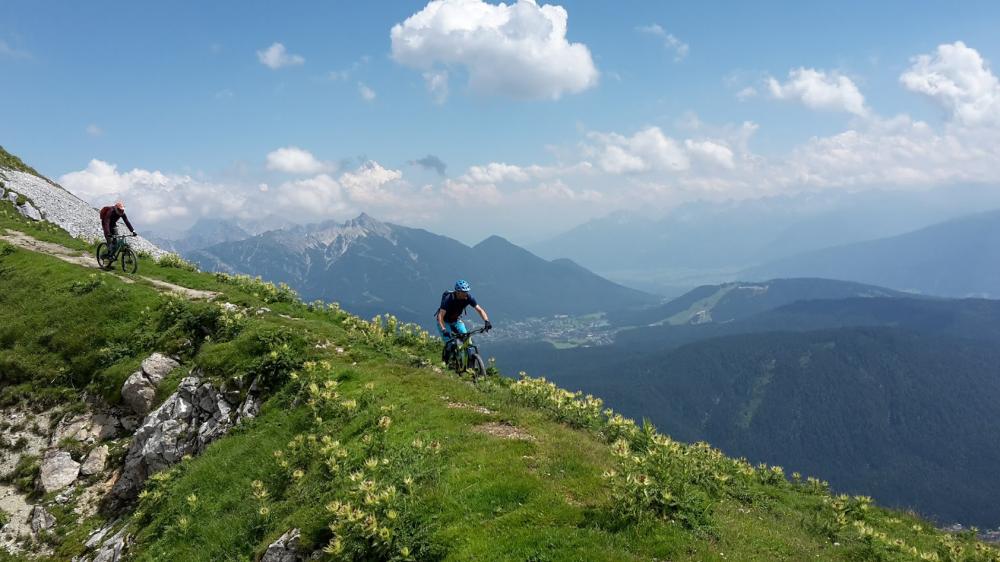 Nach einer Pause wieder Abstieg und bei den Bikes angekommen, stellte Kai fest, dass er einen Platten hatte. Der Lite-Schlauch war aufgeplatzt. So ein Dreck! Gemeinsam neuen rein und dann gings los. Am Grat sehr schön zu fahren. Später wirds dann stellenweise verblockt und man muss sein Bike ein paar mal kurz tragen. Insgesamt aber gut fahrbar. Hat Spass gemacht. Nach einem Weidegatter gehts in einen steilen Waldweg mit vielen Holzstufen. Etwas feucht, deshalb schwierig. Alle sind aber gut durchgekommen und die letzten Meter waren wieder einfacher.