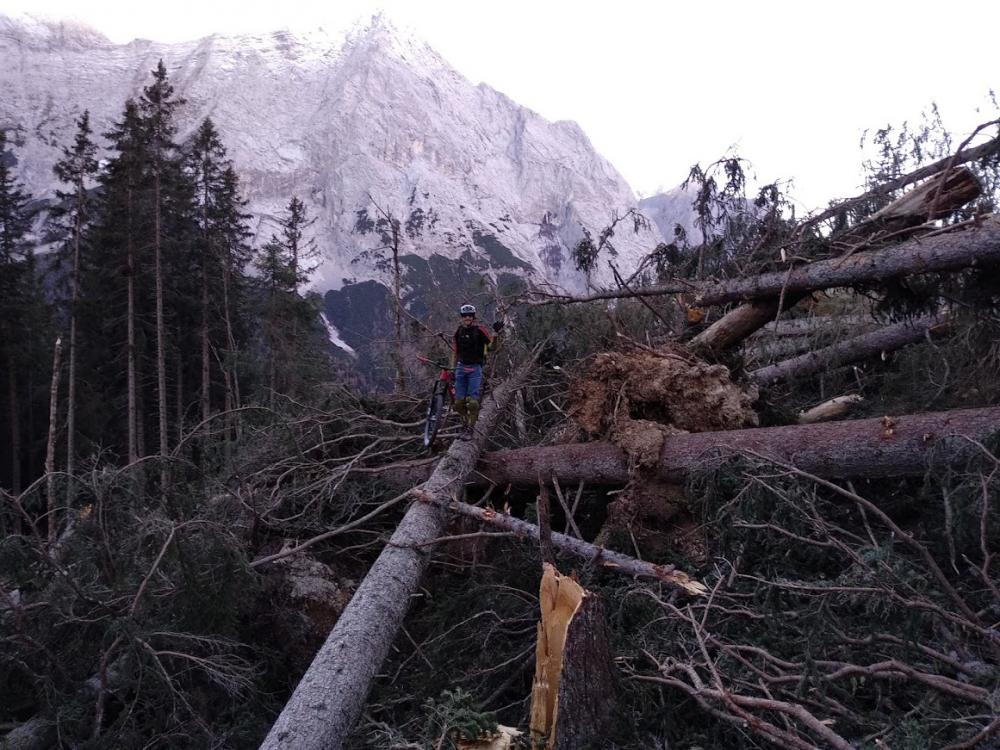 Der Weg zum Steinernen Hüttl war gut fahrbar, recht trocken. Im weiteren Verlauf dann waren aber immer wieder mal vom Wind entwurzelte Bäume über dem Weg. An der schlimmsten Stelle türmen sich die Baumstämme übereinander. Es war sehr sehr schwierig, da mit dem Rad durchzuklettern. Siehe Foto.