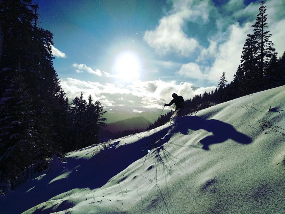 Danach runter (rechts halten wäre sinnvoll), bis es nicht mehr sinnvoll weitergeht. Schöner Schnee! Viel mehr als vermutet. Wieder aufgefellt und zur Florianshütte hoch. Ella und Martin sind eingekehrt. Manfred und ich weiter hoch und runter zum Auto.