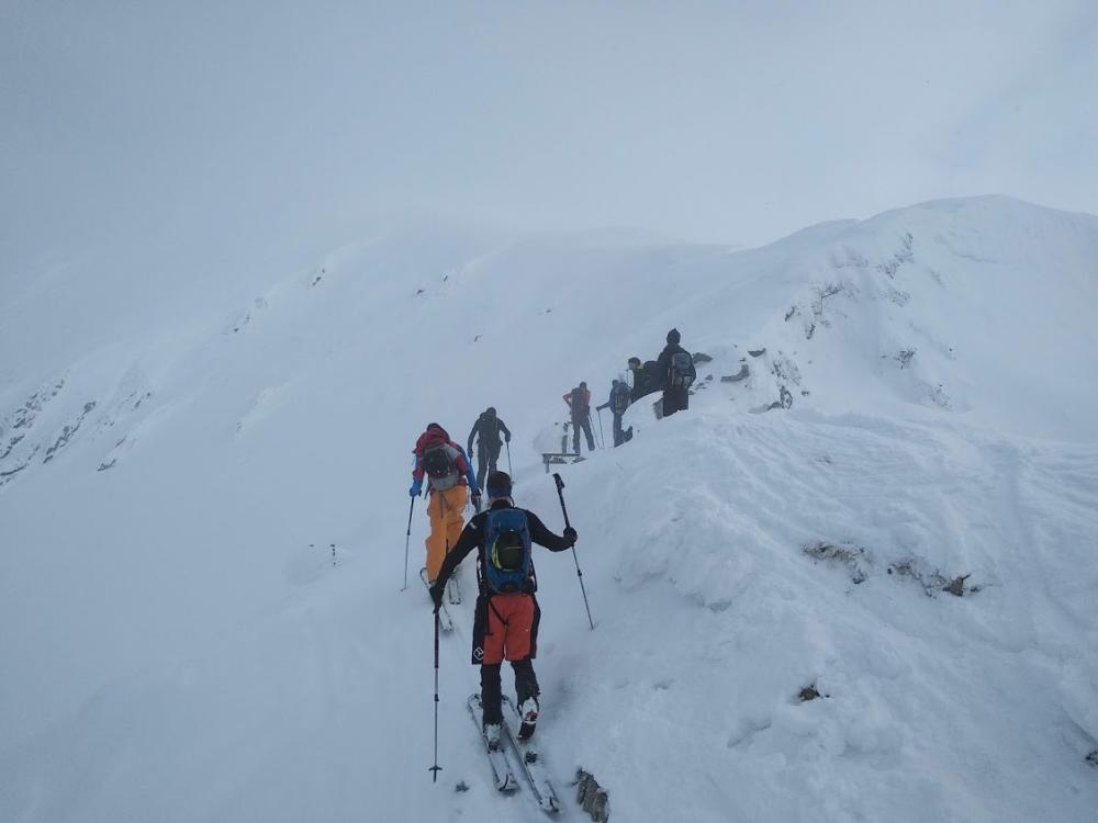 Allerdings hats zugezogen und der Gipfelgrat war total abgeblasen, so dass wir unterhalb des steilen Aufstiegs Stop gemacht haben und abgefahren sind. Und zwar zuerst eine sehr schöne Waldschneise in Richtung Westen. Ca. 250m bei perfektem Schnee. Ich habe dann wieder hochgespurt und wir sind wieder den Grat hoch. Bei der zweiten Abfahrt sind wir nach Norden in den Kessel abgefahren. Oben hat man zwar nicht viel gesehen, aber dann wurde es schnell besser. Im weiteren Verlauf schöne Hänge oberhalb der Schönwetterhütte. Der Forstweg danach war aber wegen den Spurrillen recht grausig zu fahren.