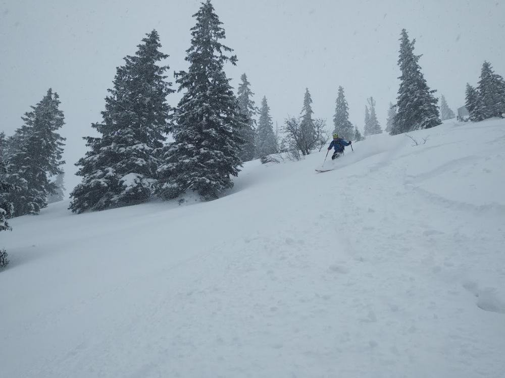 Anstelle zum Herzogstand sind wir zum Fahrenberg hoch (Gondel lief nicht). Es gab noch reichlich unverspurten Powder. Am Schlepplift-Einstieg (der Schlepplift lief auch nicht) haben wir nochmal aufgefellt, was bei Stevie und mir problematisch war. Jeweils ein Fell hat nicht mehr geklebt. Sehr mühsam und nervig! Ich brauche neue Splitboard-Felle!