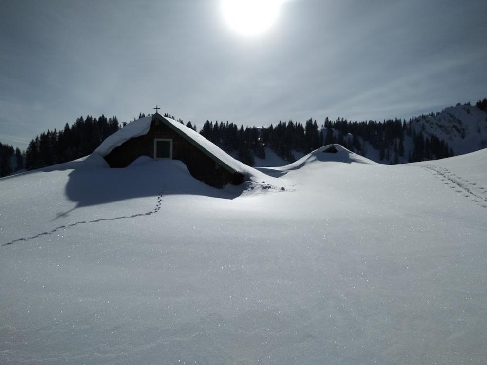 Die Rauhalmen waren total zugeschneit. Wahnsinn. 3 m Schnee! Habe dann rüber zum Schönberg gespurt, dort gab es aber schon viele Spuren. Schnee in der Abfahrt war aber auch noch gut. Dann rüber zur Hochplatte, wo es keine einzige aktuelle Abfahrtsspur gab. Die Wächte oberhalb des Osthanges war mir zu groß, also sind wir ganz vorsichtig den Nordhang runter. Nach ca. 100hm gibts da eine krasse Gleitschnee-Abriss-Kante. Über die ganz vorsichtig drüber und dann endlich in schönes unverspurtes Gelände. Toller Schnee/Abfahrt. Unten dann durch den Wald gekämpft (ging ganz gut) und zur Schwarztennalm zurück. Es gibt 2 Schneisen, die man fahren kann.