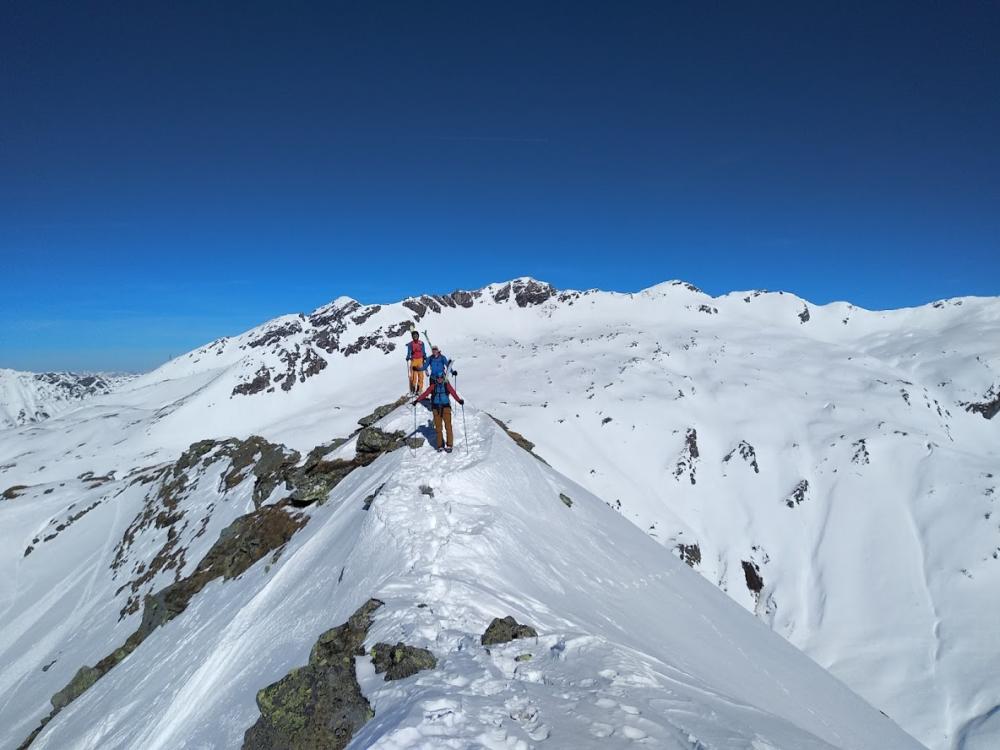 Irgendwann gestoppt und zur Abfahrt fertig gemacht. Immer noch auf der Suche nach der Rinne.. Nach der Scharte sah ich Spuren, die immer den Hang querend oben blieben. Das waren die richtigen Spuren und hätten uns zur Rinne gebracht. Leider wussten wir das nicht und sind an einer Stelle, wo es auf der einen Seite sehr eisig war, lieber zu Fuß 100hm abgestiegen - anstelle noch weiter zu queren und den Einstieg der Rinne zu finden. Soooo ärgerlich. Wir haben dann aber in der Nähe der Hagener Hütte auch eine schöne Rinne gefunden. Genauso steil, allerdings war der Schnee nicht mehr pulvrig. Erst unten raus wars wieder schöner Pulver. Man muss dann noch ca. 15 Minuten das Tal raussschieben.