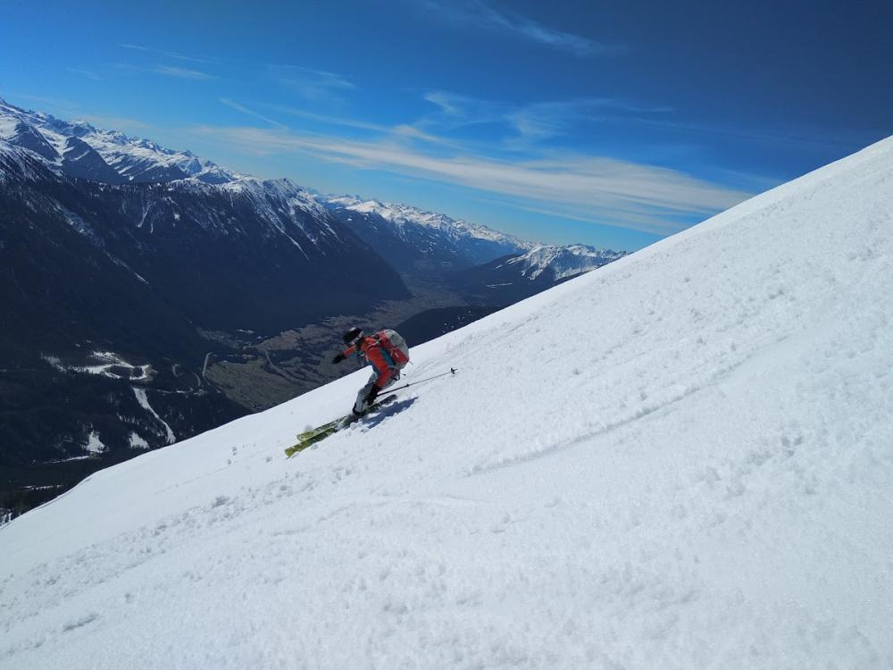 Nach einer sonnigen Rast entschlossen wir uns die tolle Südflanke runterzufahren (geht nur bei sicheren Verhältnissen) und unten dann nach links zum Lift zu queren. Passt recht gut, gibts mehrere Möglichkeiten.