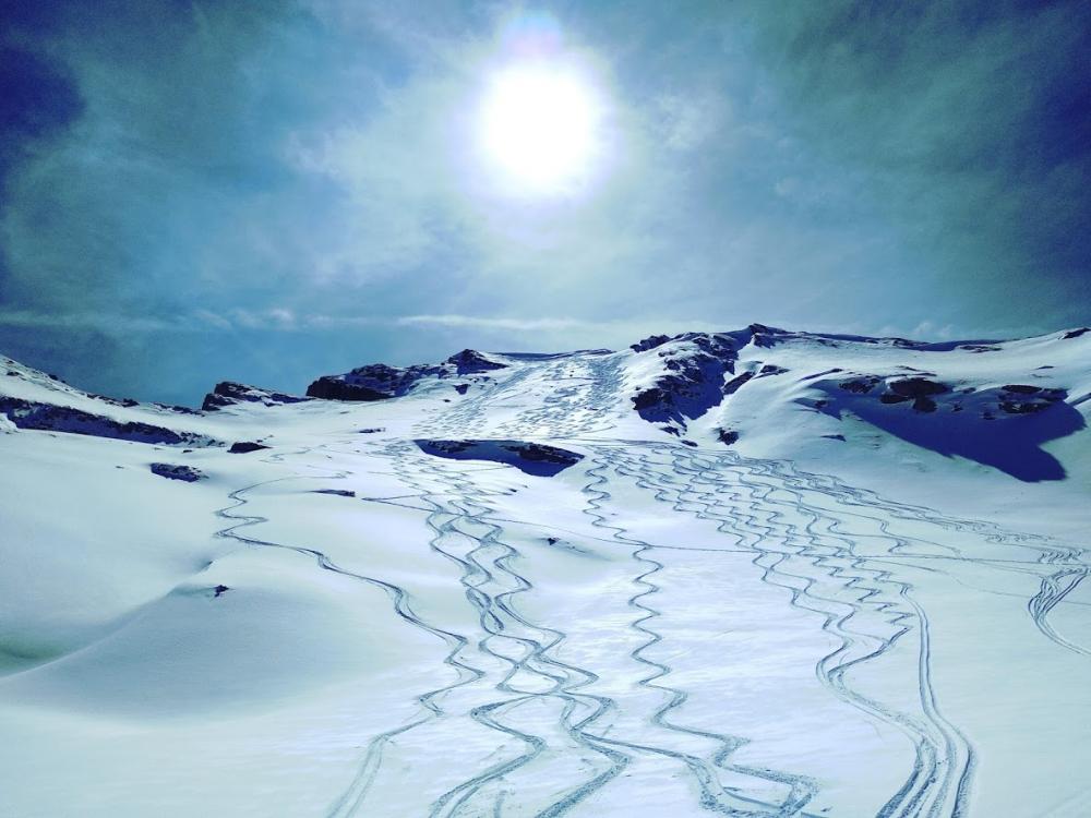 Abfahrt dann erstmal nordseitig Richtung Pues-Ebene. Sehr schöner Hang mit sehr schönem Pulver. Allerdings musste man wieder auf Steine achten. Bene's Ski hat's erwischt: Kante etwas rausgebrochen....