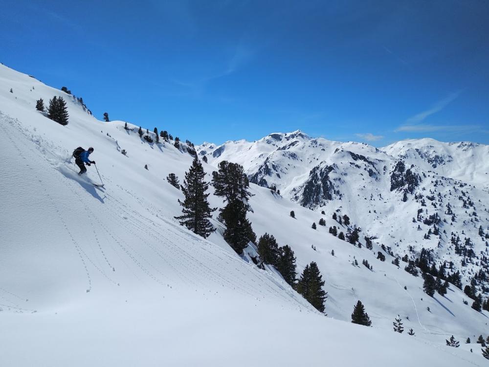 Schon viele Leute um 9 Uhr am Parkplatz. Wir hinten geparkt und links hinten auf der Piste hoch. Es gab schon eine Spur. Unten Bruchharsch, später schöner Pulver. Nach der Hälfte ging die Spur nach rechts aus dem Skigebiet raus und langsam hoch bis man zum Joch kommt. Dort haben wir umgebaut und sind erstmal in Richtung Südwesten abgefahren. Unberührter Poweder. Einfach traumhaft. Ab ca. 1900 wurde der Schnee etwas schwerer, so dass Alfred und Ella dort wieder angefellt haben. Ich bin mit dem Board noch etwas weiter runter. Erst am Gipfel (Marchkopf, 2499m) haben wir uns wieder getroffen. Super schön. Kein Wind. Super Sonne. Was will man mehr? Ich bin dann vom Gipfel erst vorsichtig abgerutscht (Steine) und dann in den steilen Gipfelhang rein. Sehr schön! Unten nach links gezogen, um die anderen zu treffen, die links um den Berg rum sind. Abfahrt bis zur Hälfte super, danach schwerer Schnee. Im unteren Teil sind wir Piste gefahren, die wohl noch etwas besser fahrbar war als der Rest. Ohne Steinberührung bis zum Auto. Fantastisch.