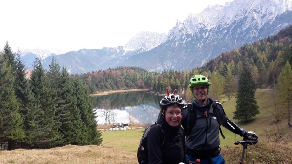 Hoch zur Ehrwalder Alm. Weiter hoch zur Pestkapelle. Dann ins Gaistal. Kühl/Kalt, aber sehr schön. In Leutasch den schönen Rad/Wanderweg am Wettersteinmassiv entlang - bis dieser aufhört. Auf der anderen Talseite bis kurz vor der Geisterschlucht weiter. Auf Straße nach Mittenwald. Abgeboten zum Lautersee und Ferchensee. Dort die erste richtige Pause. Weiter über Schloß Elmau und vorderes und hinteres Graseck die steile Straße zur Partnachklamm runter. Viele Touris! Auf dem Radweg Tommy zufällig getroffen. Hoch zum Eibsee (viele Touris!) und zum Thörle. Gut mit anderen Bikern unterhalten (einer war aus Grainau). Bei der Thörlehütte habe ich mich von Jutta und Michael verabschiedet. Ich bin links in den Forstweg und dann in den Bayersteig links rein. Flowig. Dann ein Stück Forstweg fahren bis man links auf den Abzweig Bankerl-Trail kommt. Auch dieser ist flowig. Kurz bergauf und man ist auf der Straße nach Ehrwald. Runter gerast und über den Moosweg völlig erschöpft ins Hotel.