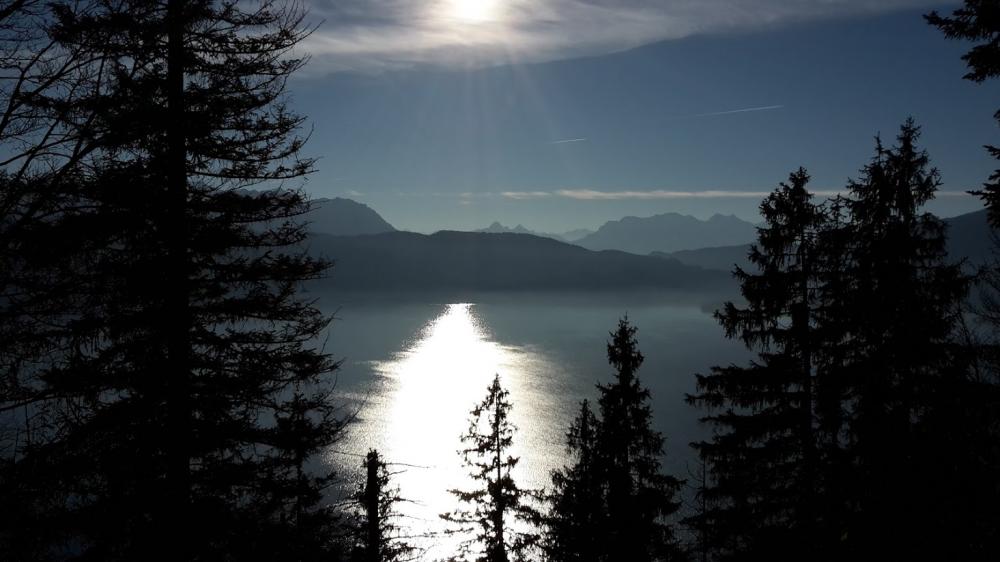 Nebel im Oberland. Nebel am Kochelsee. Aber am Kesselberg haben wir blauen Himmel erspäht. Geparkt.